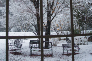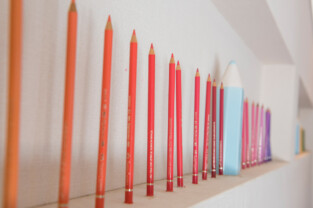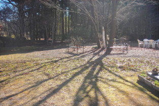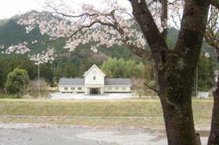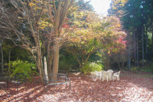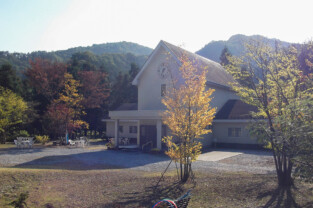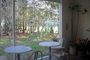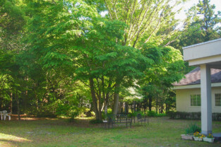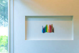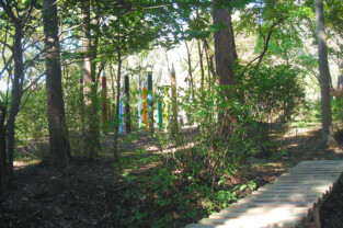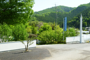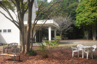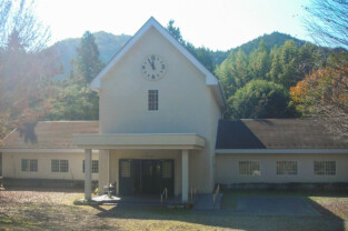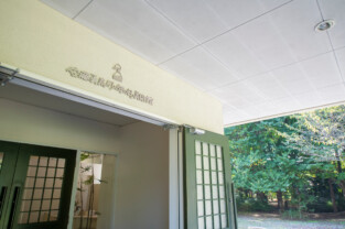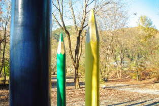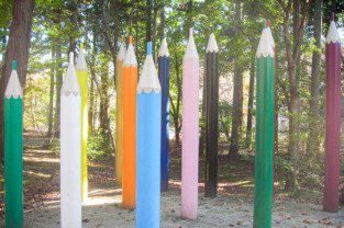 旗川(はたがわ)に沿って御神楽(みかぐら)橋を渡ると大きな欅(けやき)の木が出迎えてくれます。その先の木立の前にそびえる巨大な12色の色鉛筆は、なんだろうと思われるかも知れませんが、美術館に入っていただくとその答えが見つかるでしょう。川のせせらぎ、山の緑、風のざわめきが感じられるこの白い美術館は、どこか懐かしさややさしさに包まれます。